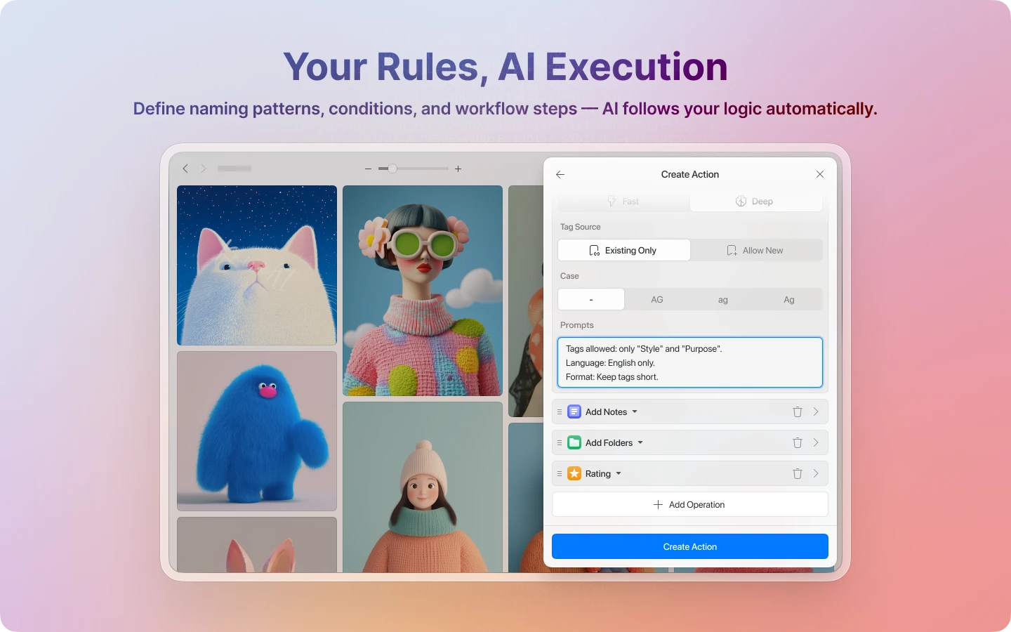 AI Action can batch-process tagging for you. Based on your tagging system, you can have AI analyze color, style, subject, mood, intended use, composition, or whatever dimensions matter to you. The clearer your tag groups, naming conventions, and rules, the better the results.