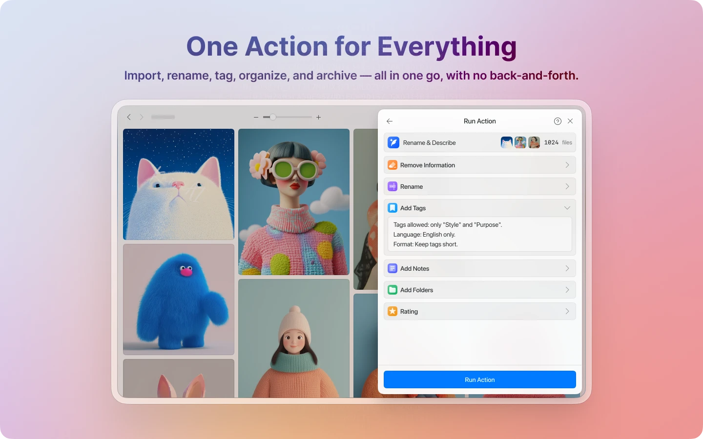 AI Action lets you hand your organization rules to AI so it can execute them in bulk. No more renaming files one by one, writing descriptions manually, sorting into folders, or tagging each image by hand. You create Actions based on your own workflow, choose which operations to run, pick a model, and write Custom Instructions to go with them. AI follows your logic, not its own.